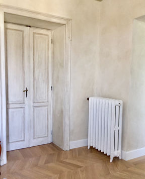A project involving both decoration and restoration: the old ceilings were beautifully decorated, albeit reuined by time and weather. The project involved some interventions on the existing paintings, which were paired with glazed walls in neutral colors. Finally, the doors were restored, painted and given an antiqued finish.